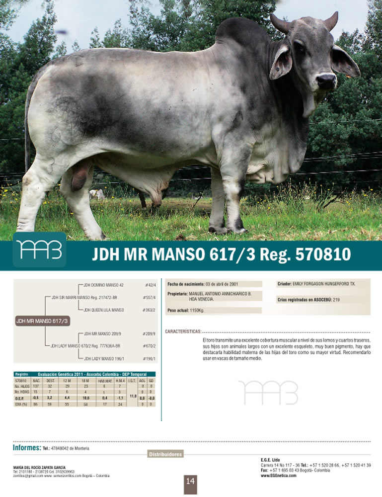 PADRE: JDH SIR MARRI MANSO 557/4 MADRE: JDH LADY MANSO 670/2 RAZA: BRAHMAN GRIS