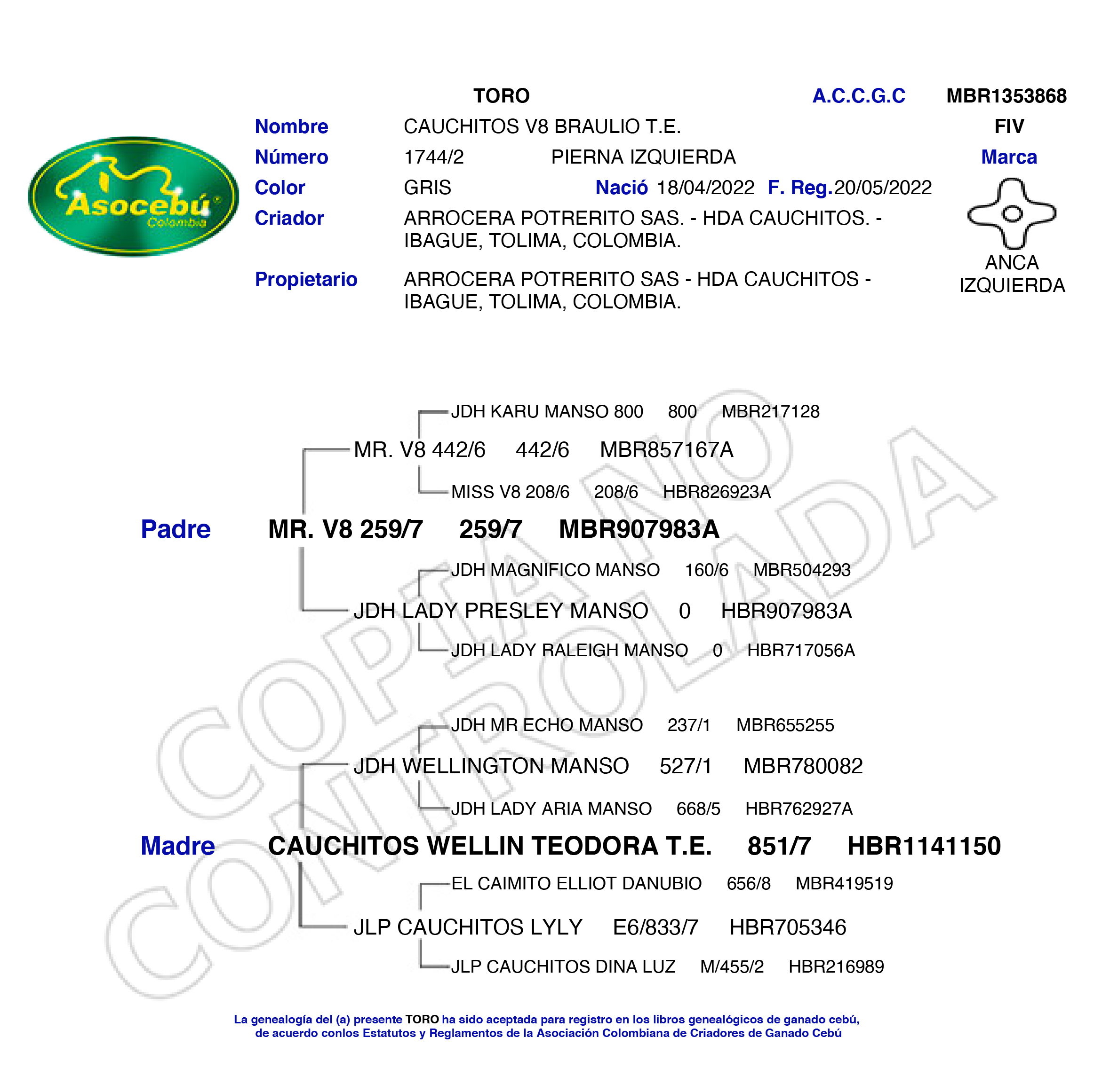 PADRE: MR. V8 259/7 MADRE: CAUCHITOS WELLIN TEODORA T.E. 851/ RAZA: BRAHMAN GRIS