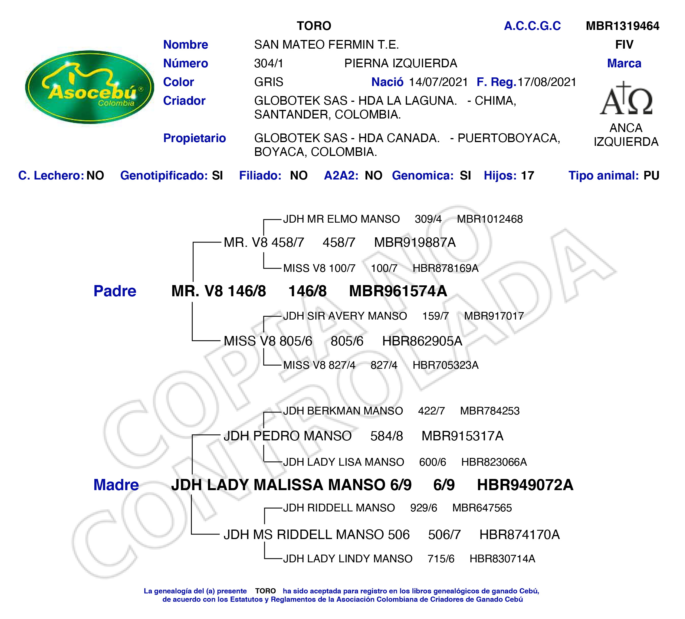 PADRE: MR. V8 146/8 MADRE: JDH LADY MALISSA MANSO 6/9 RAZA: BRAHMAN GRIS