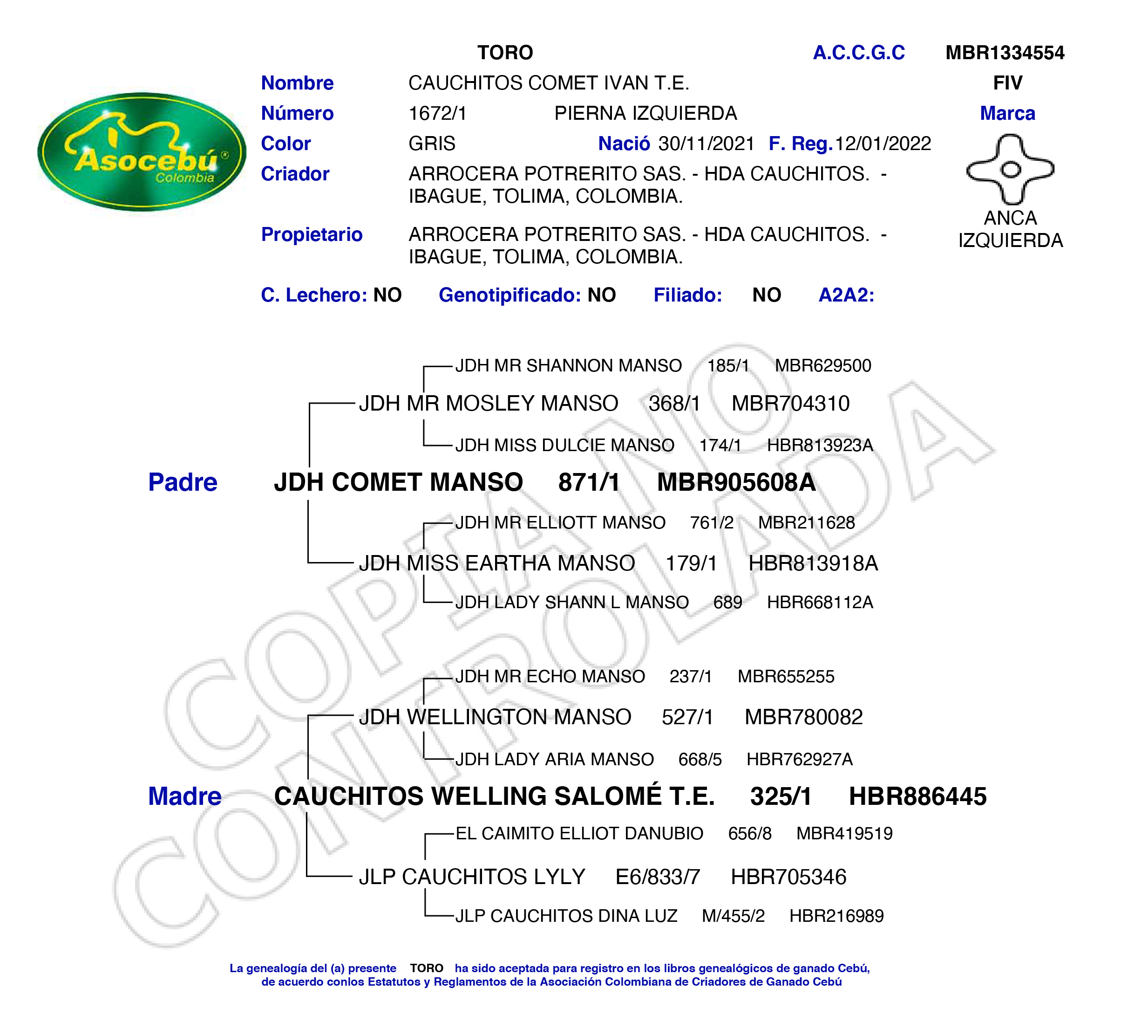 PADRE: JDH COMET MANSO 871/1 MADRE: CAUCHITOS WELLING SALOMÉ T.E. RAZA: BRAHMAN GRIS