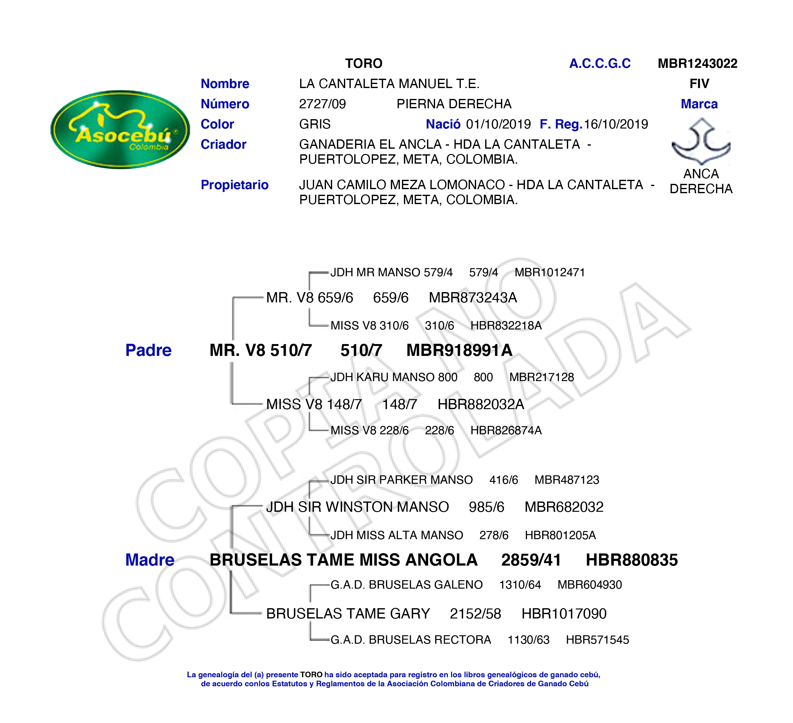 PADRE: MR. V8 510/7 MADRE: BRUSELAS TAME MISS ANGOLA RAZA: BRAHMAN GRIS