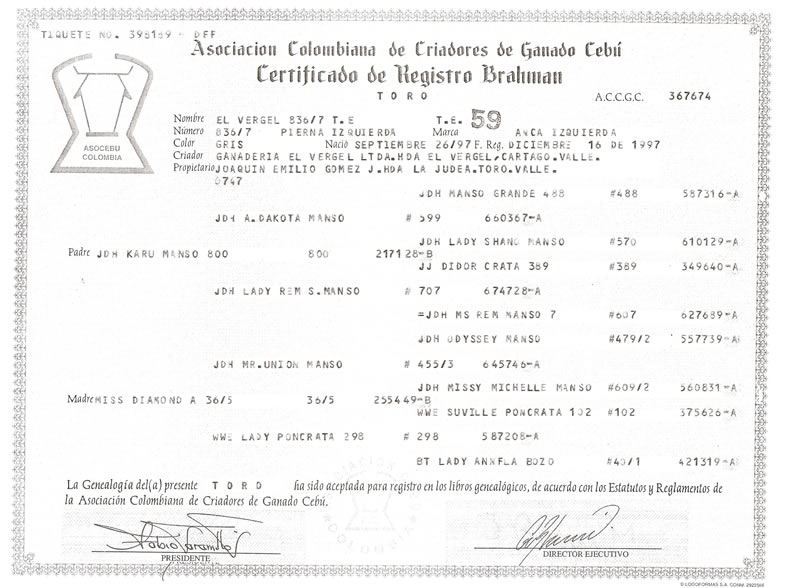 PADRE: JD JARU MANSO 800 MADRE: MISS DIAMONS A 36/5RAZA: BRAHMAN GRIS