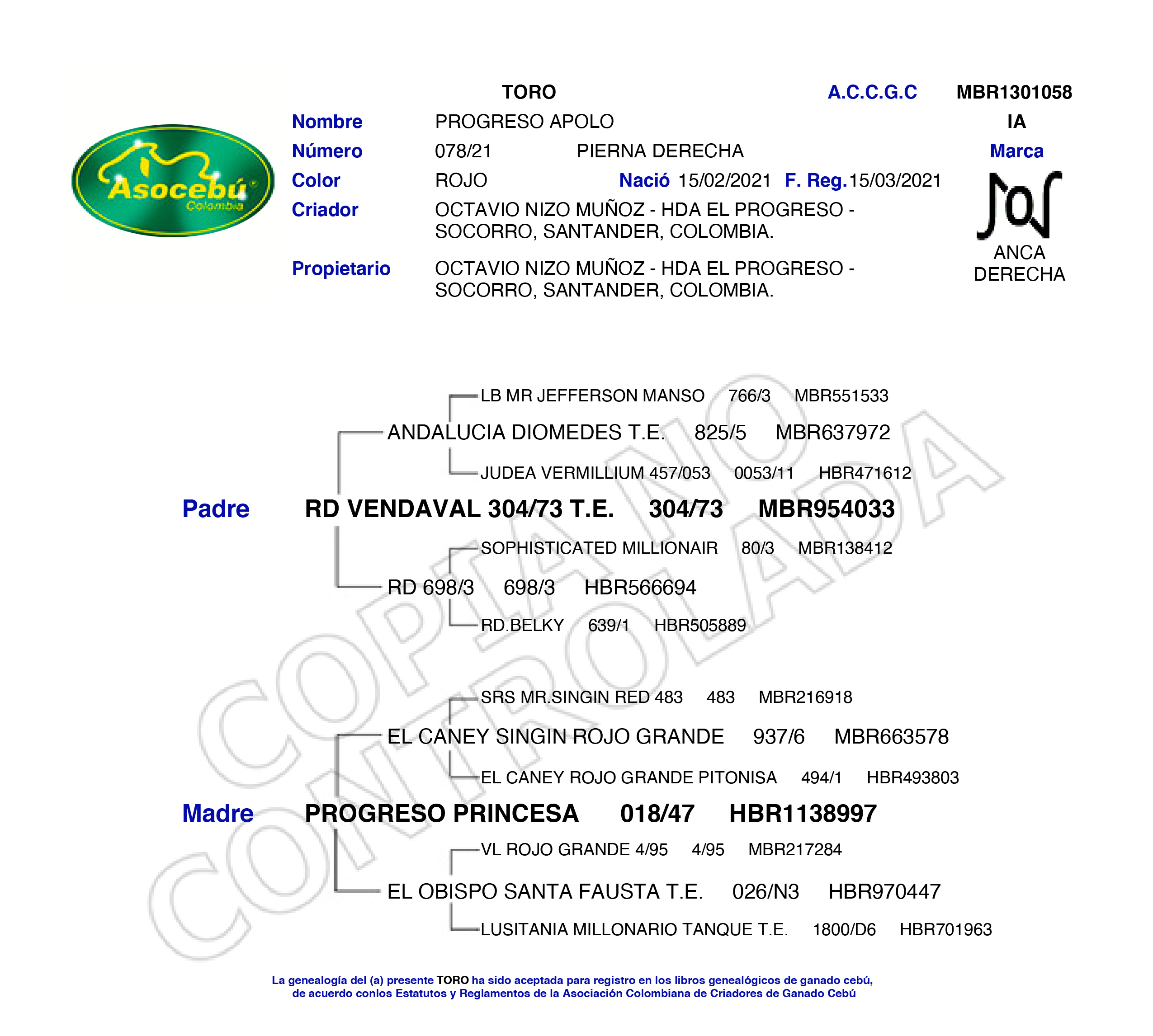 PADRE: RD VENDAVAL 304/73 T.E. MADRE: PROGRESO PRINCESA RAZA: BRAHMAN ROJO