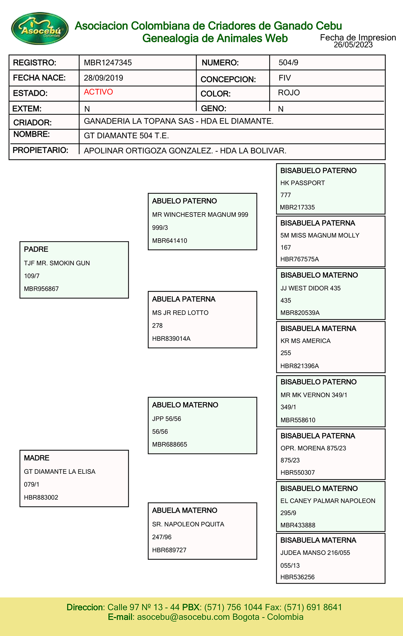 PADRE: TJF MR. SMOKIN GUN MADRE: GT DIAMANTE LA ELISA RAZA: BRAHMAN ROJO