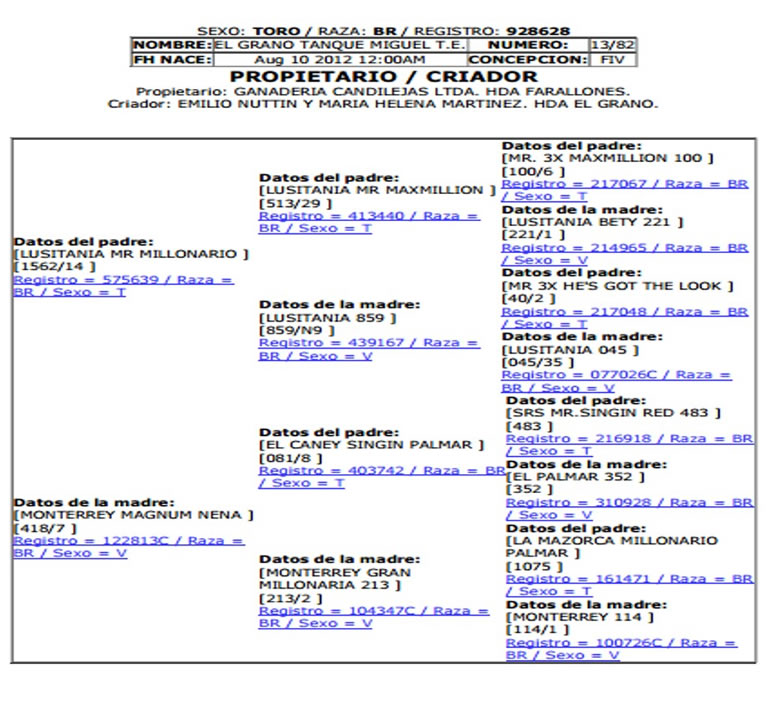 PADRE: LUSITANIA MR MILLONARIO MADRE: MONTERREY MAGNUM NENA RAZA: BRAHMAN ROJO