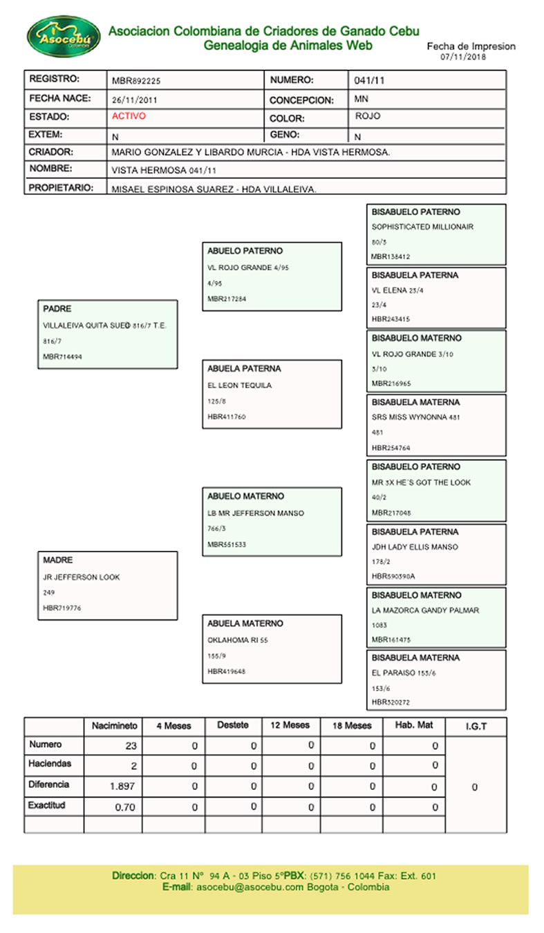 PADRE: VILLALEIVA QUITA SUEÑO 816/7 T.E. MADRE: JR JEFFERSON LOOK RAZA: BRAHMAN ROJO