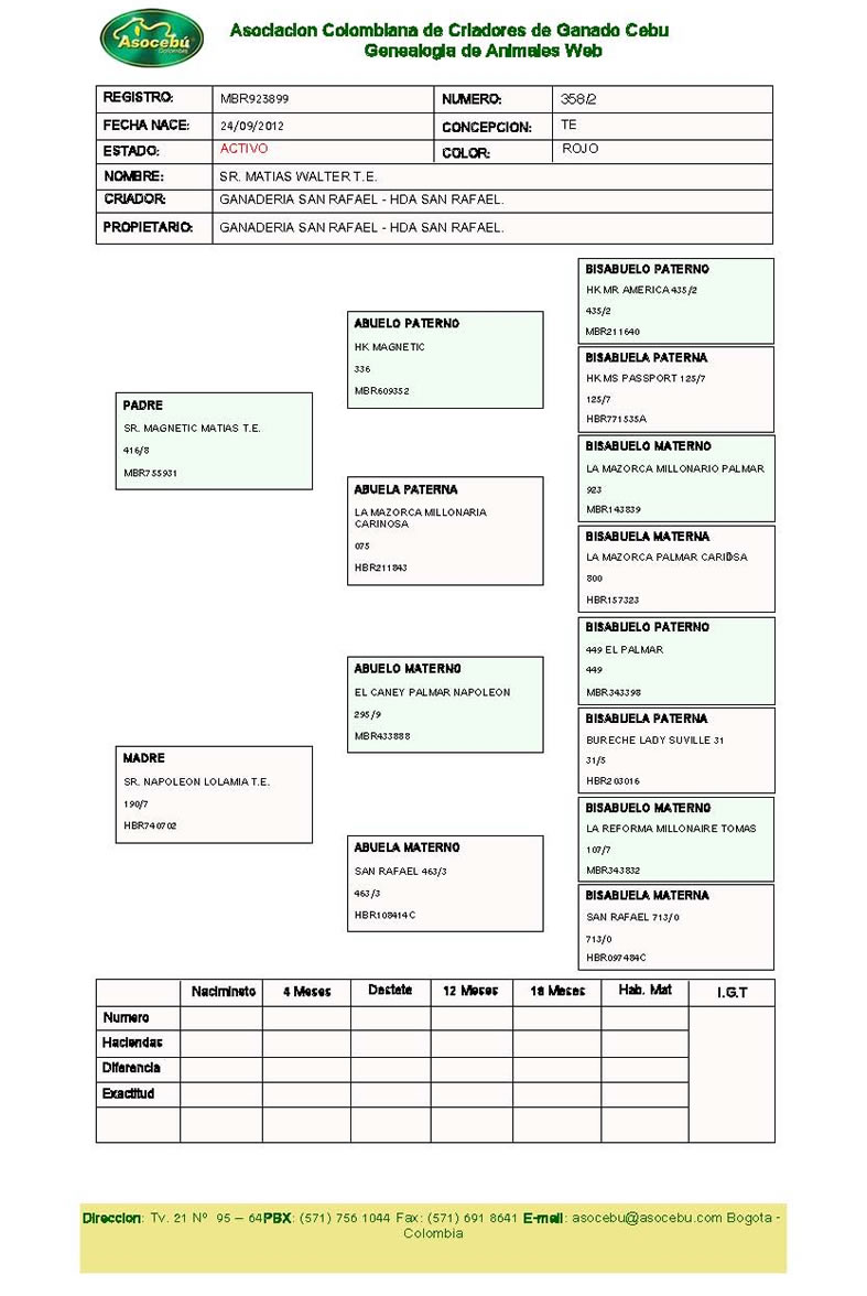 PADRE: SR. MAGNETIC MATIAS TE MADRE: SR. NAPOLEON LOLAMIA TE RAZA: BRAHMAN ROJO