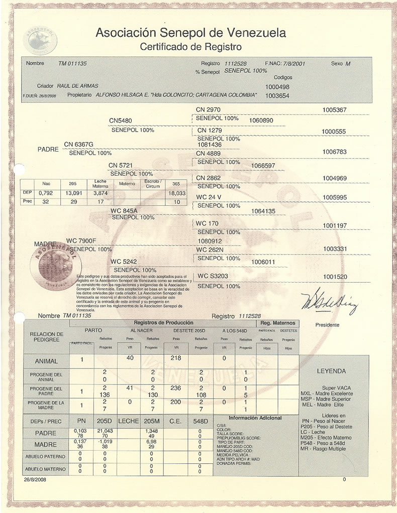 NÚMERO: 11135 FECHA DE NACIMIENTO: 08/7/2001 TIPO: CARNE RAZA: SENEPOL