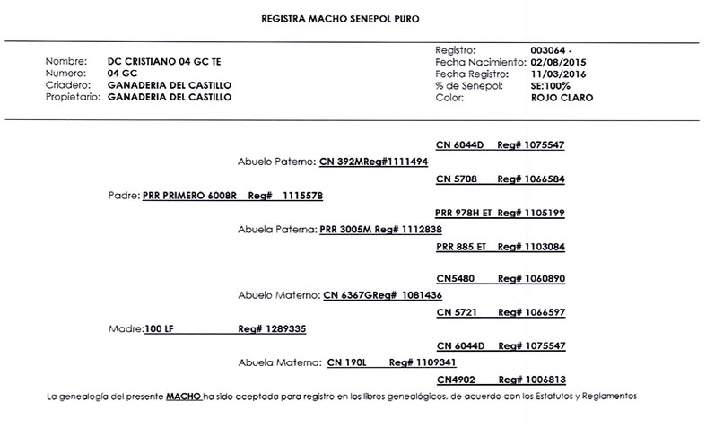 NÚMERO:04 GC FECHA DE NACIMIENTO: 02/08/2015 TIPO: CARNE RAZA: SENEPOL