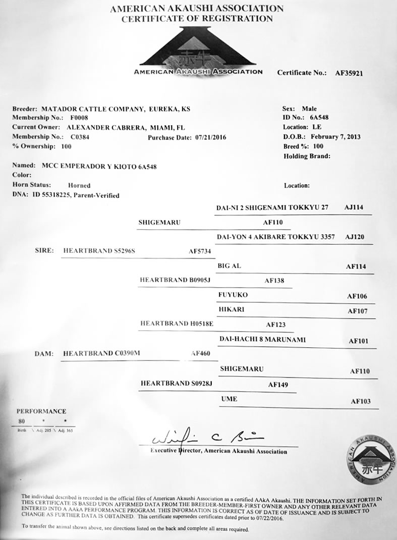 NÚMERO:6A548 REGISTRO: 55318225 FECHA DE NACIMIENTO: 07/02/2013 RAZA: WAGYU - AKAUSHI