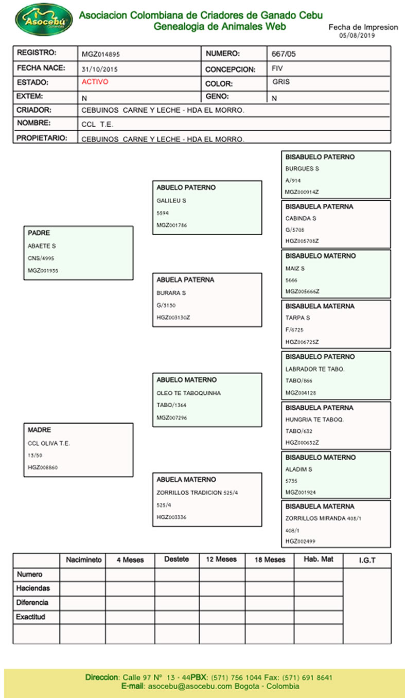 PADRE: ABAETE S MADRE: CCL OLIVA T.E. REGISTRO: MGZ014895 RAZA: GUZERAT