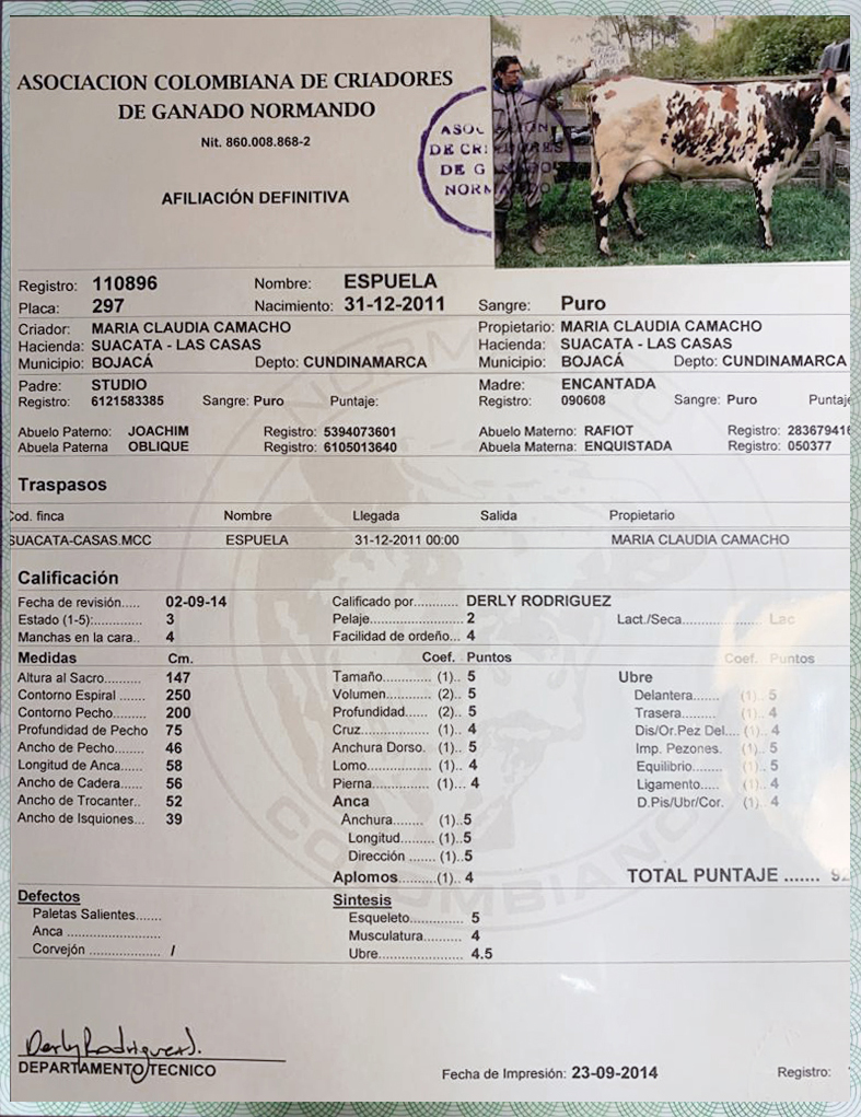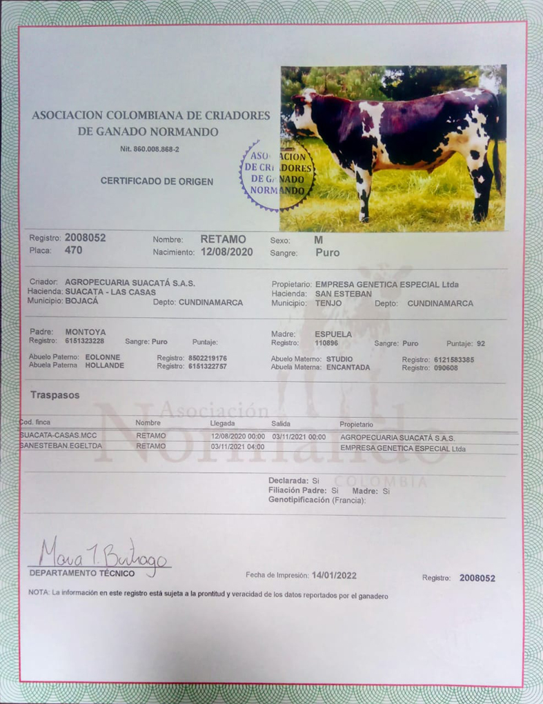 PADRE: MONTOYA MADRE: ESPUELA REGISTRO: 2008052 RAZA: NORMANDO