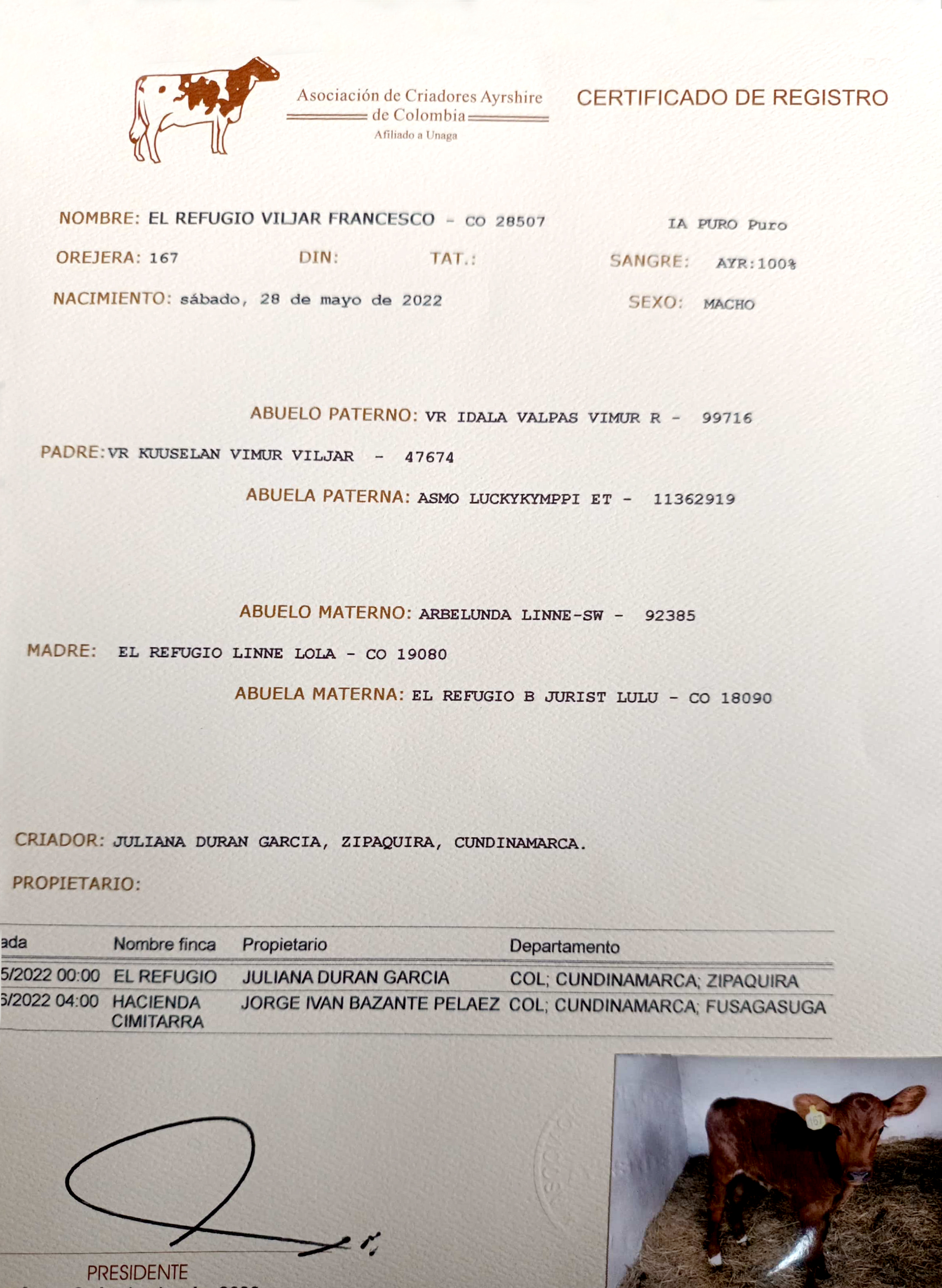 NÚMERO: 167 FECHA DE NACIMIENTO: 28/05/2022 TIPO: LECHE RAZA: AYRSHIRE