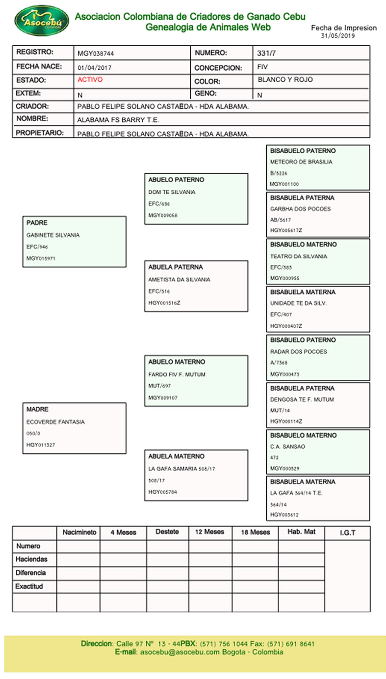 NÚMERO: 331/7 FECHA DE NACIMIENTO: 01/04/2017 TIPO: LECHE REGISTRO: MGY038744