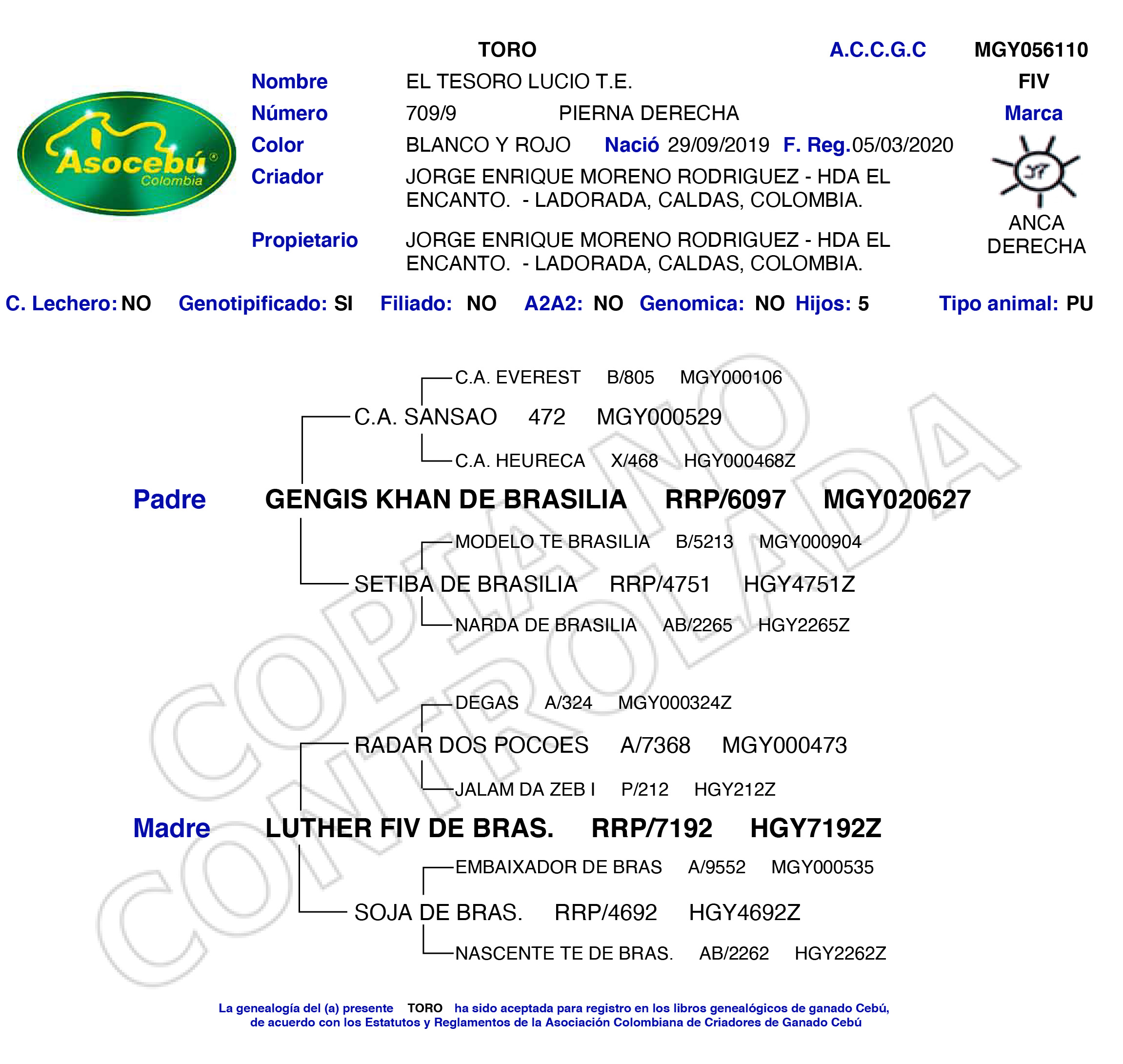 PADRE: GENGIS KHAN DE BRASILIA RRP/6097 MADRE: LUTHER FIV DE BRAS. RRP/7192 RAZA: GYR