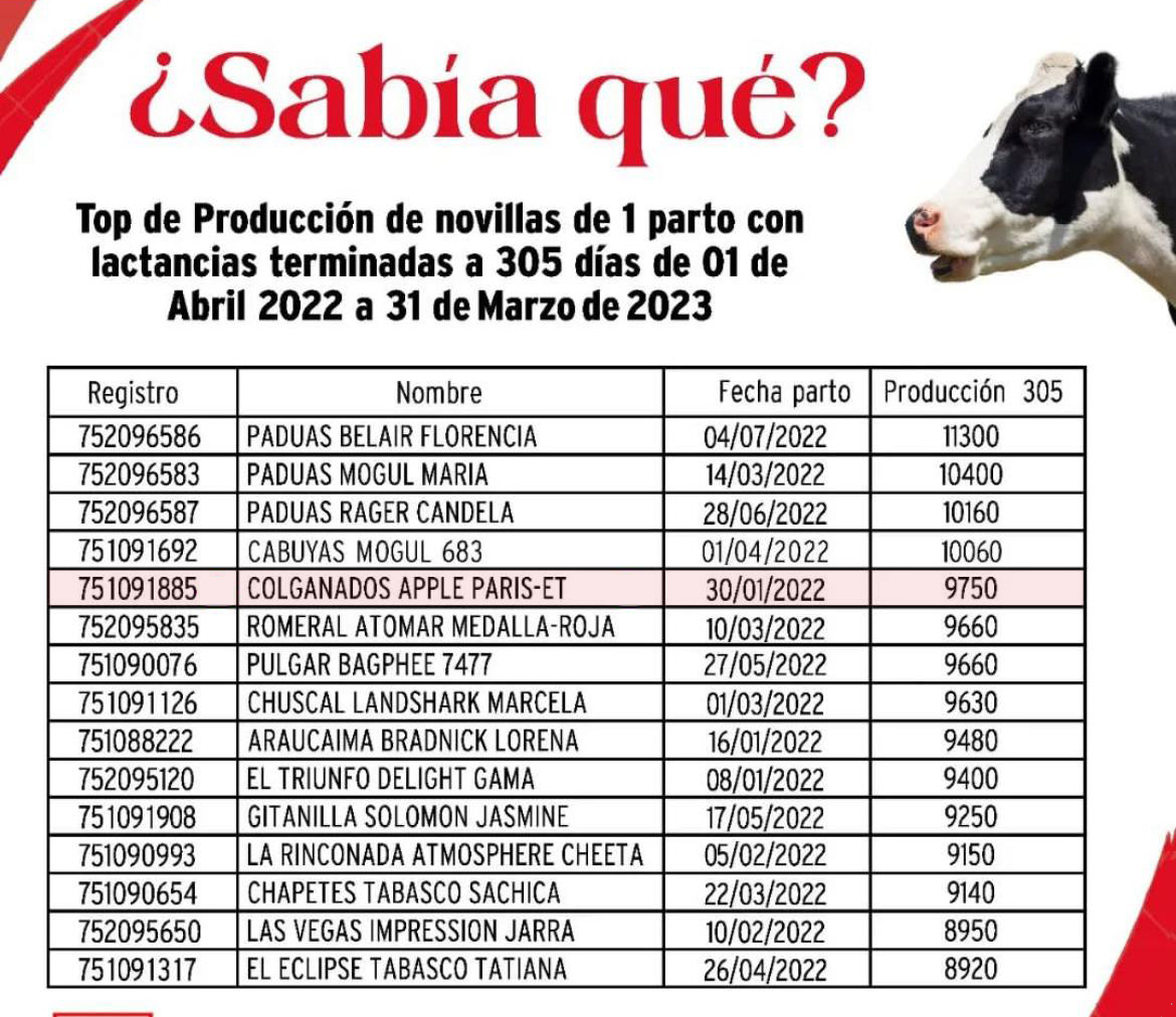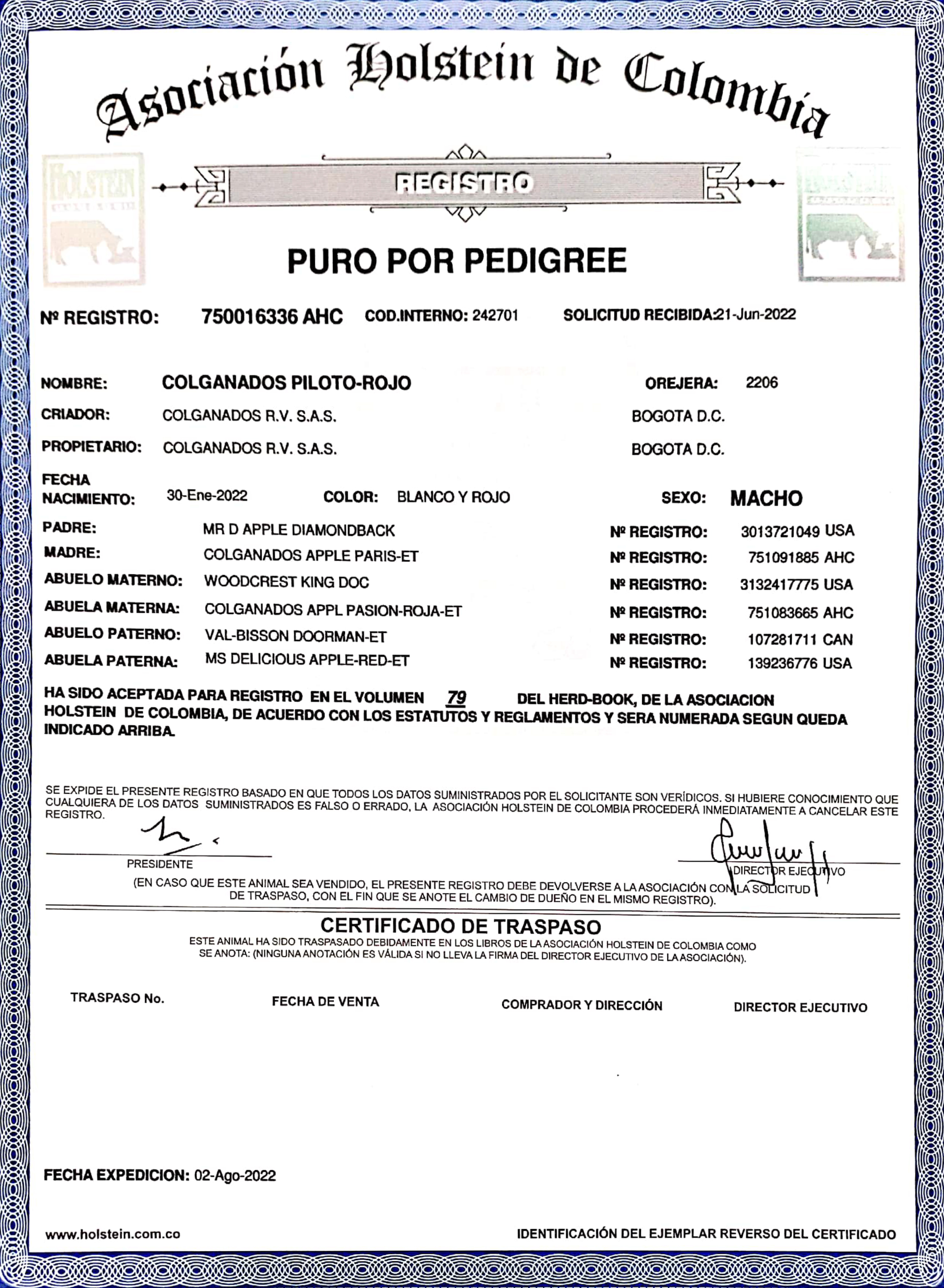 PADRE:MR D APPLE DIAMOND BACK MADRE:COLGANADOS APPLE PARIS ET RAZA:HOLSTEIN ROJA