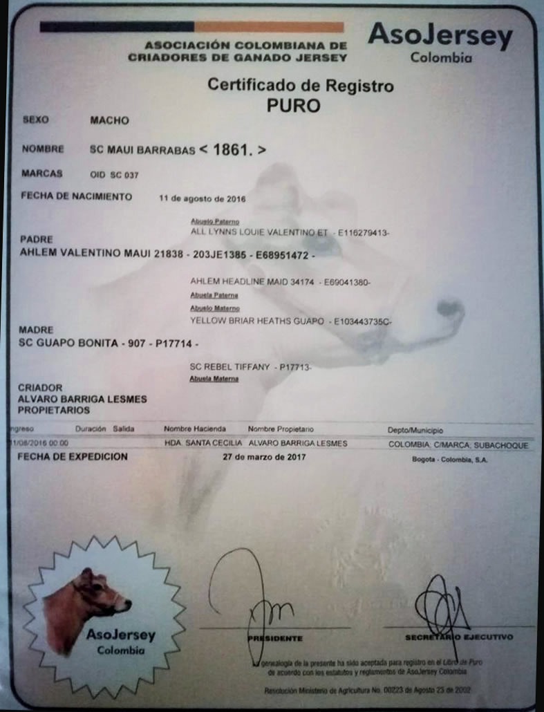 PADRE: AHLEM VALENTINO MAUI MADRE: SC GUAPO BONITA 907* REGISTRO: OID SC037 RAZA: JERSEY