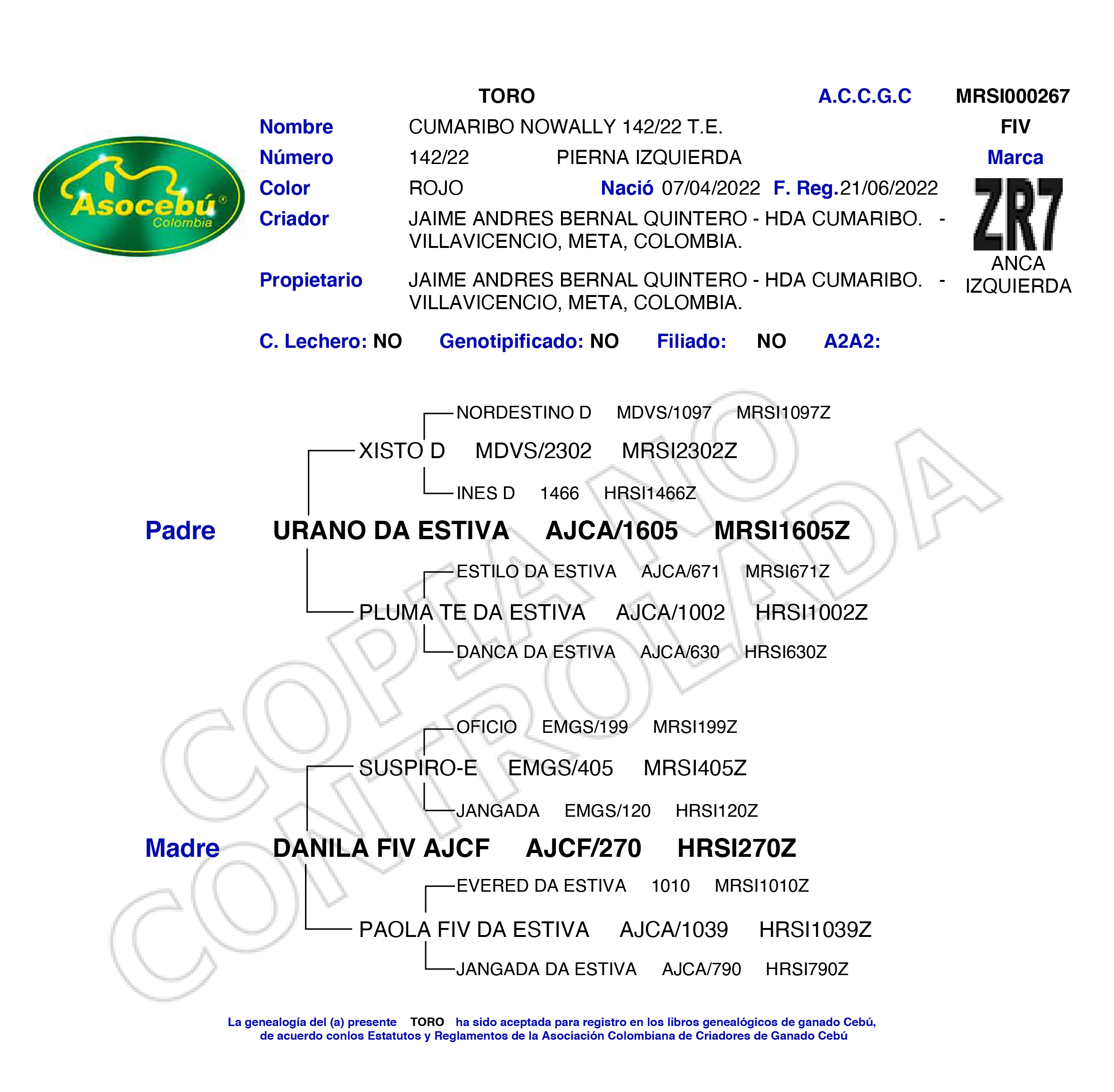 PADRE: URANO DA ESTIVA MADRE: DANILA FIV AJCF REGISTRO: MRSI000267