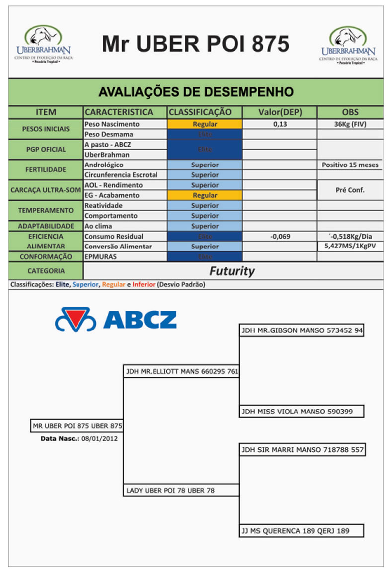 - Mr UBER POI 875 es Elite en Prueba de Desempeño ABCZ / UberBrahman y Superior en Prueba de Eficiencia Alimenticia.