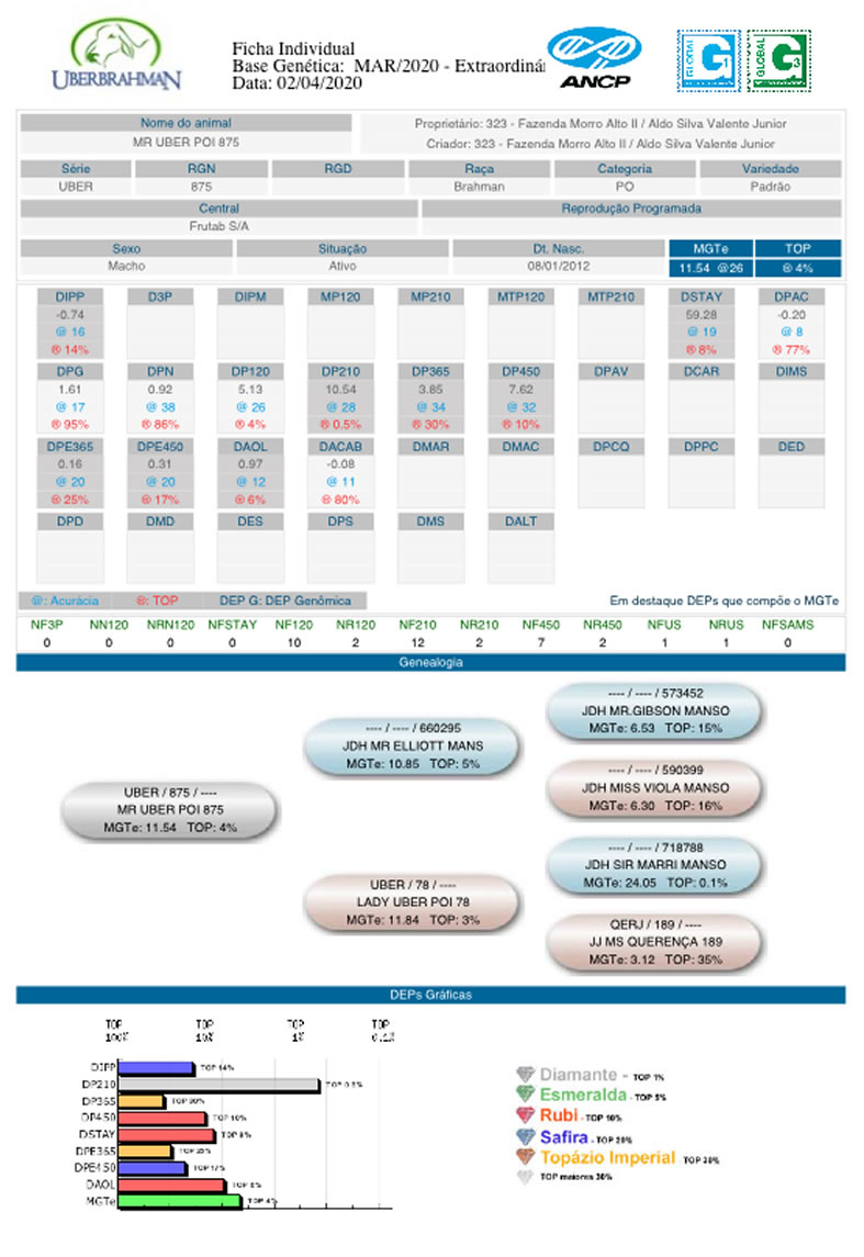 - Su madre, Lady UBER POI 78 es la actual líder en DEP de Eficiencia alimenticia en UberBrahman. Donante de excelente desempeño, carcasa y mucha fertilidad. Es hija directa de la QERJ 189, una de las matrices más importantes de la raza Brahman y del líder de sumario en varios países Marri Manso.